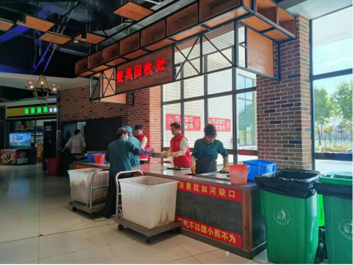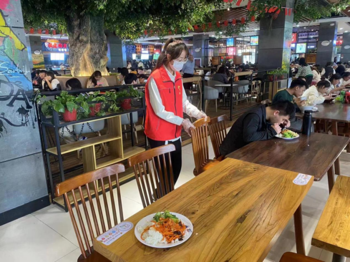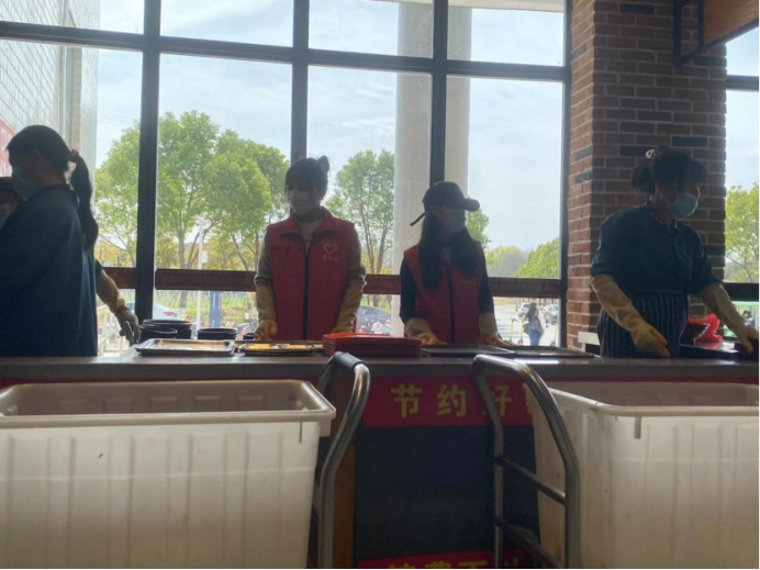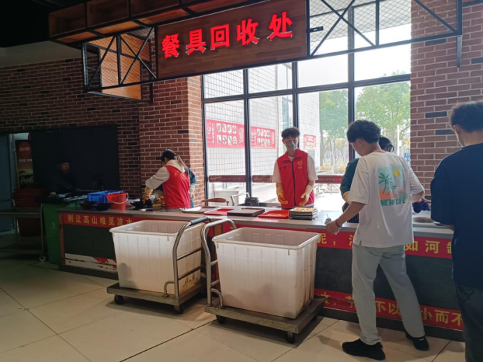我院青年志愿者协会参与成员统一服装维持就餐秩序,各个小组分工明确,协助食堂清洁阿姨对餐桌上的残留物进行清理,在餐具回收处协助工作人员回收餐具并进行分类。