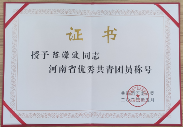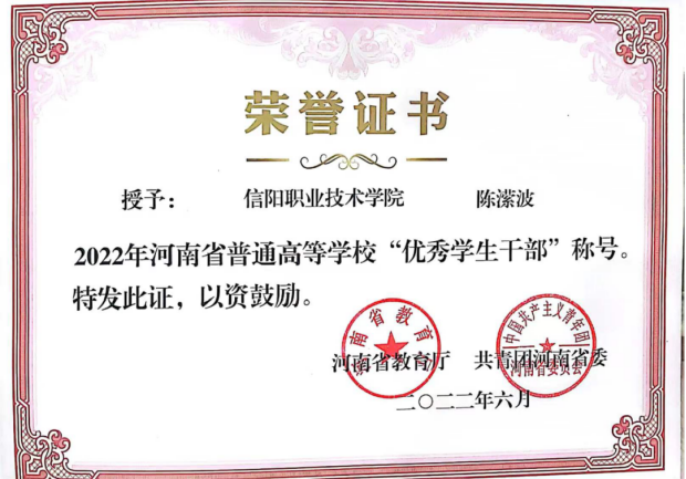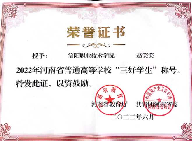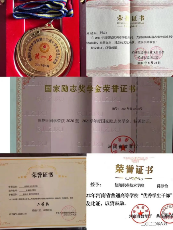 获奖情况:“河南省优秀共青团员”“河南省优秀学生干部” “信阳市优秀共青团员” “魅力团支书” “三好学生”“优秀共青团干部”“社会实践先进个人”等