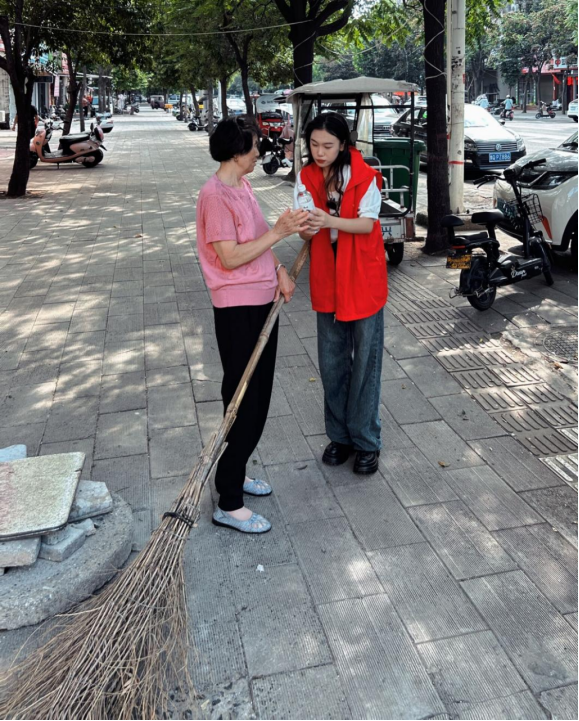 陈怡冰同学在河南省西平县城重渠乡居委会作为大学生志愿者参与2023年“清凉夏天,为爱而行”志愿服务活动。她主要负责的内容是为城市中的各个环卫工人送水。在这炎炎夏日里,送出的水不仅是为环卫工人的身体带来清凉,更慰藉了彼此的心灵。