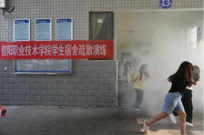 随着警报的响起与烟雾的弥漫,消防疏散演练正式开始,辅导员沉着冷静地指挥同学们有序撤离宿舍。
