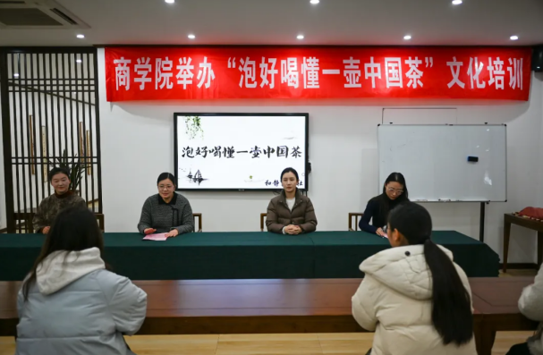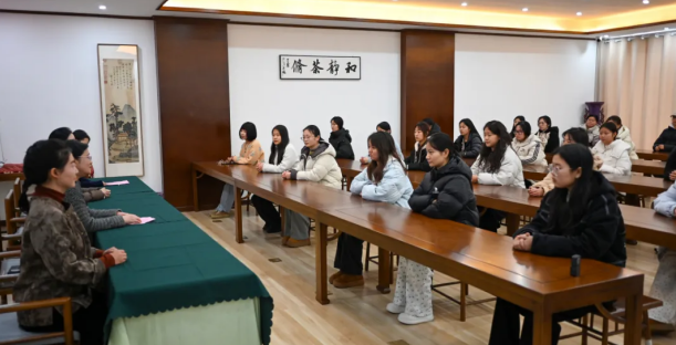 刘书记做动员讲话,她说茶修讲究"和静通圆"的处世哲学,与商科教育倡导的"诚信经营、和谐共赢"理念不谋而合;茶修演示中"器为茶之父,水为茶之母"的辩证思维,恰是商业决策中资源整合的生动隐喻,并期待通过这样的文化沉浸,让青年学子在茶香氤氲间感悟中华文化精髓,将"精行俭德"的茶人精神转化为现代商业伦理。