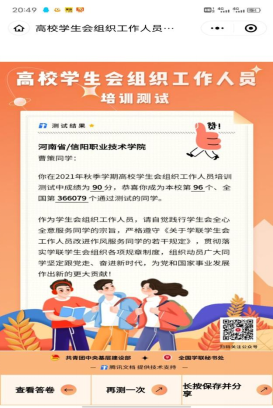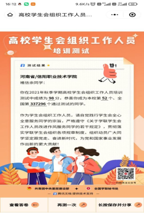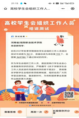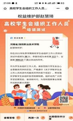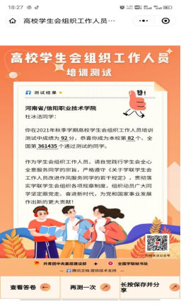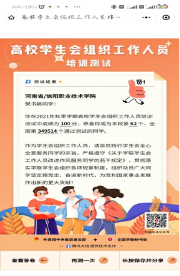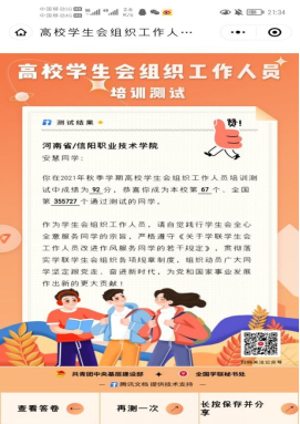 为了进一步强化学生干部职责,明确学生干部要全心全意为同学服务的宗旨,更加了解中华全国学联的价值。信阳职业技术学院极品人妻短裙少妇美腿潮喷团总支于2021年11月9日夜晚召集所有学生干部开展关于“坚定跟党走,奋进新时代”的培训测试答题活动。