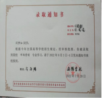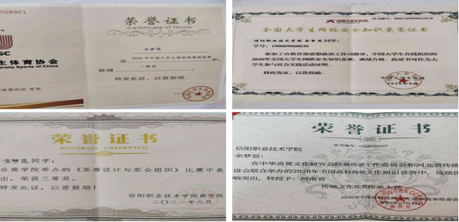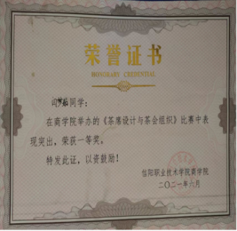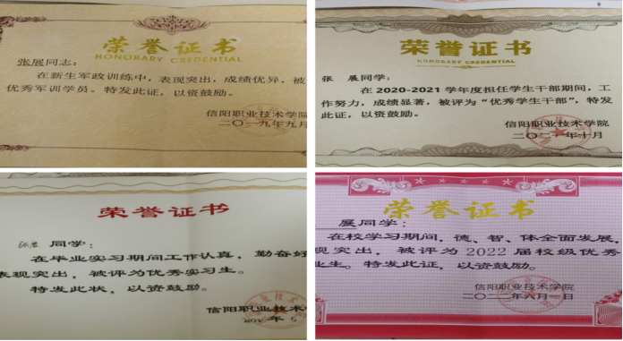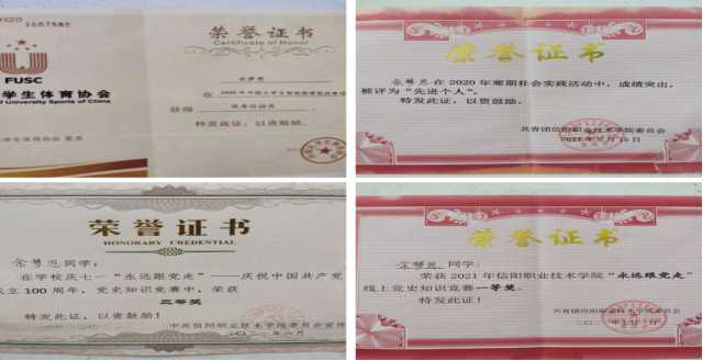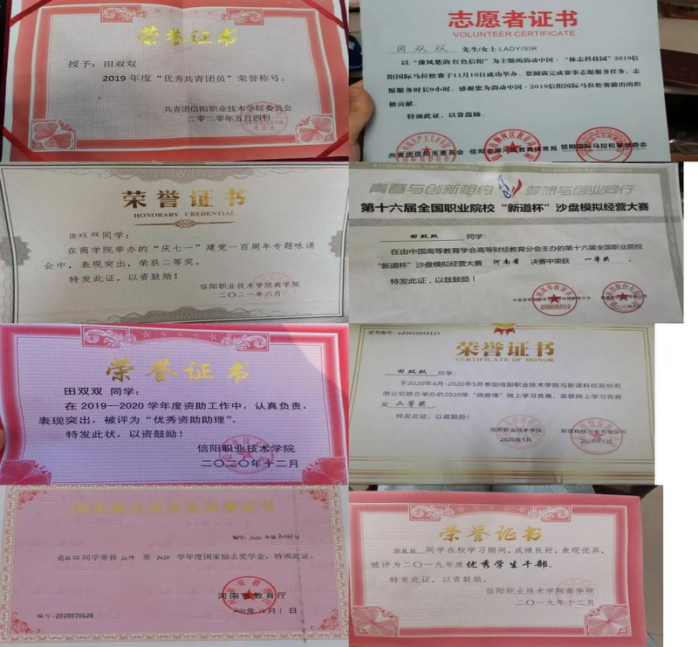 个人简介:在校期间一直担任就业资助委员,品学兼优,自立自强,积极参加校内各项活动。先后获得一等奖学金、校级三好学生、国家励志奖学金、线上党史知识竞赛一等奖、寒暑假参加社会实践活动被评为“先进个人”、河南省传统文化优秀传承大使、中国大学生优秀运动员、校园心理健康知识竞赛二等奖、茶席设计三等奖等荣誉。