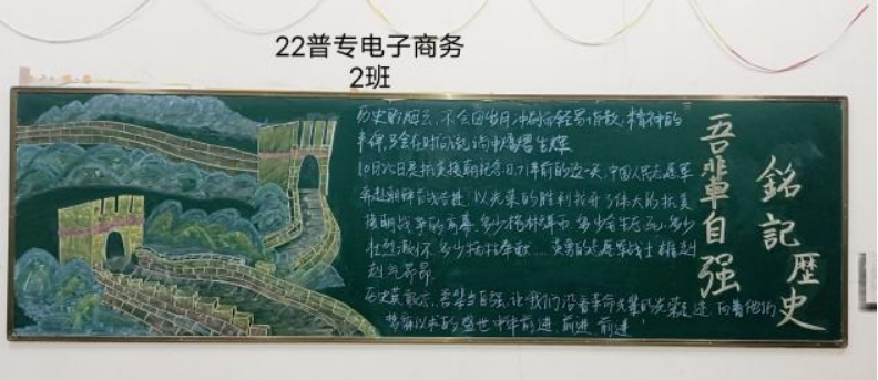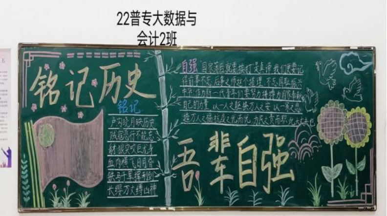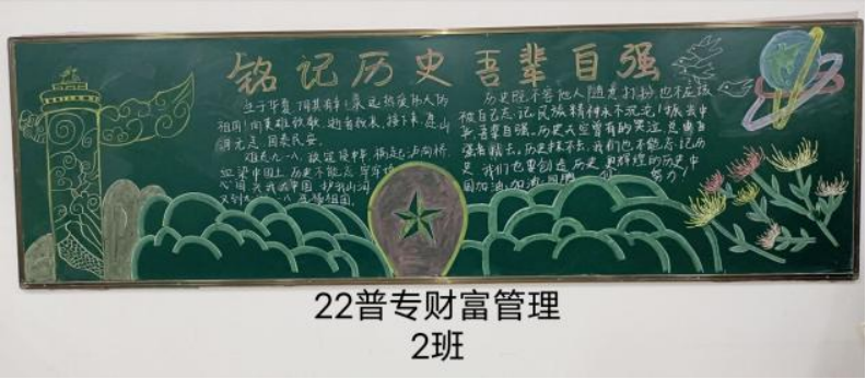 本次活动由各班团支书组织开展,各班都办了相关主题的黑板报,板报上的文字和图画都激励着同学们吾辈当自强。活动伊始,全体同学肃然起立,庄严地注视着五星红旗冉冉升起,内心无比激动,团支书情绪高昂的带领同学们面向国旗重温誓词,最后以国歌结束,这提醒了我们作为当代青年学生勿忘国耻,要铭记历史,心怀感恩,奉献自己的一份力。