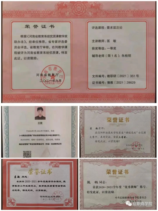 2021年,是努力工作的一年,是刻苦学习的一年,也是收获满满的一年。这一年里,我先后取得了“河南省教育系统优质课一等奖”、“校级优秀教师”、“校级教育教学质量考核优秀奖”、“河南省高等职业教育青年教师教学创新大赛二等奖”、“院级课程思政示范课三等奖”等荣誉,同时取得了网络运营推广职业等级中级证书。