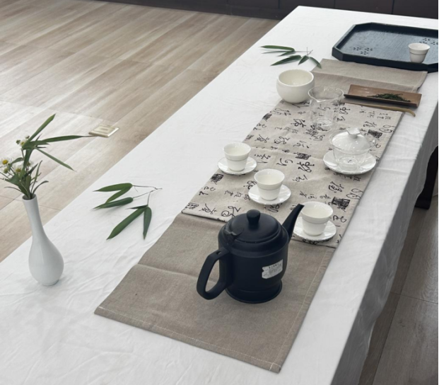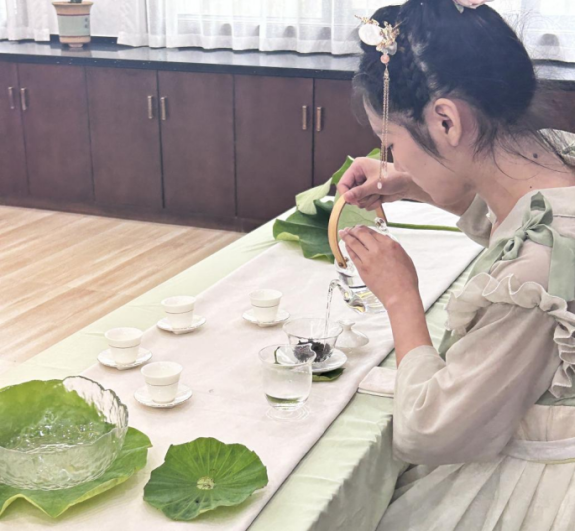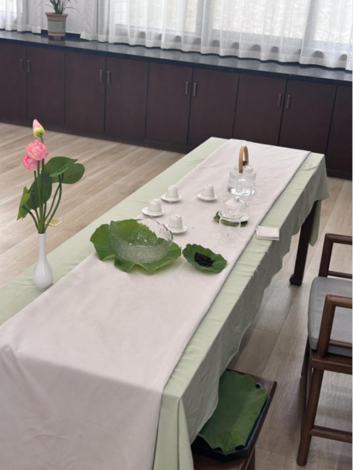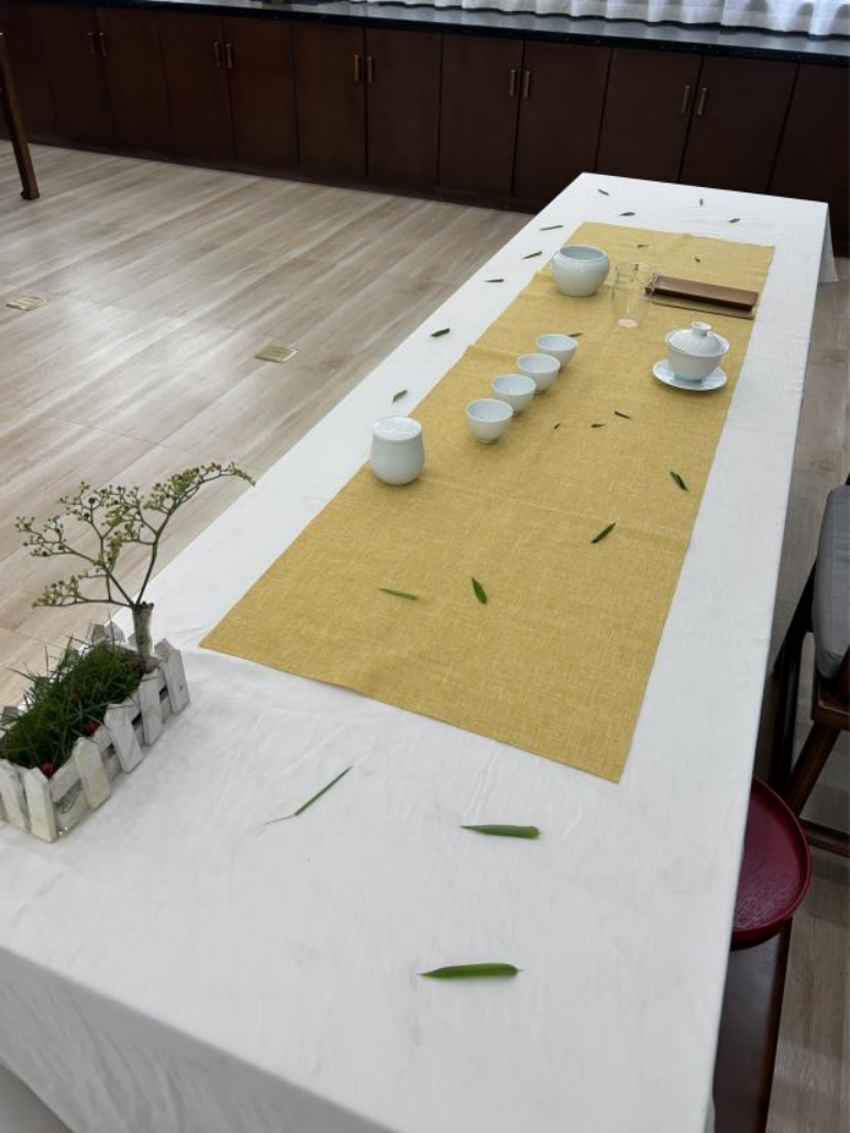 活动在悠扬婉转的音乐中开始,每一组茶席都是精心设计、力求完美,有的采用当季花卉布置插花,有的选择传统中式摆设。经过一学期的沉淀,同学们淡定优雅、举手投足和谐地融合在一起,宛如一幅古色古香的水墨画。学院领导和老师一一进行点评,指出优点和存在的不足,同学们受益匪浅。